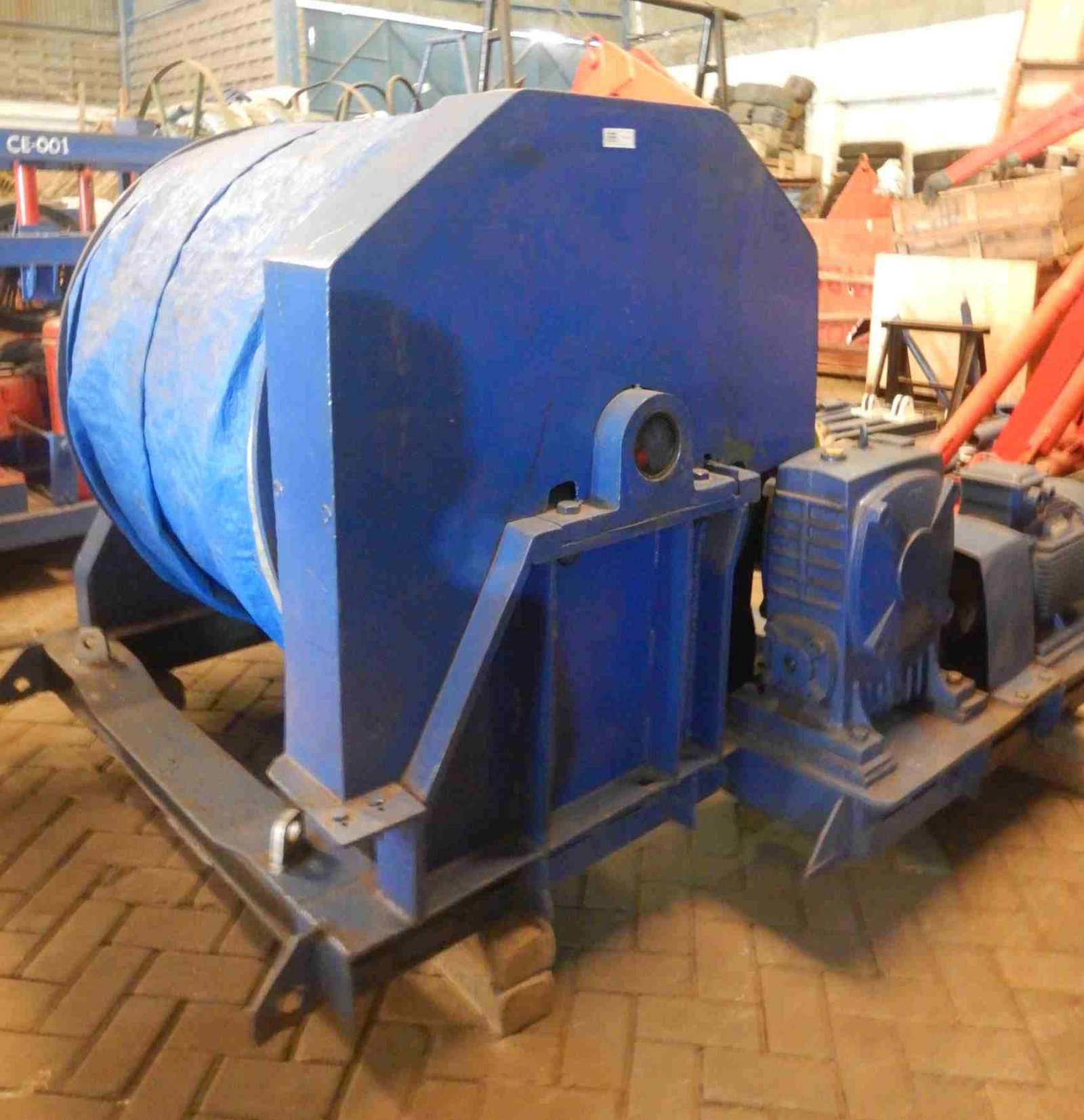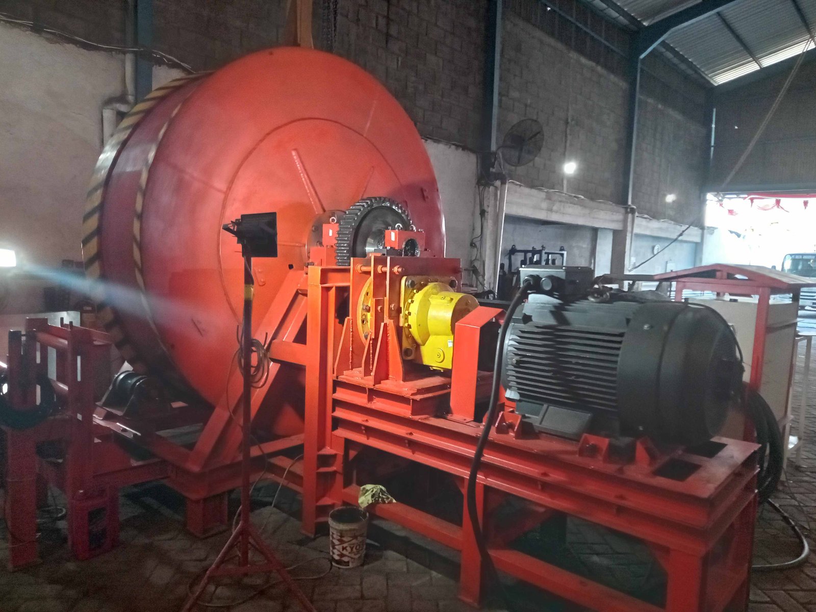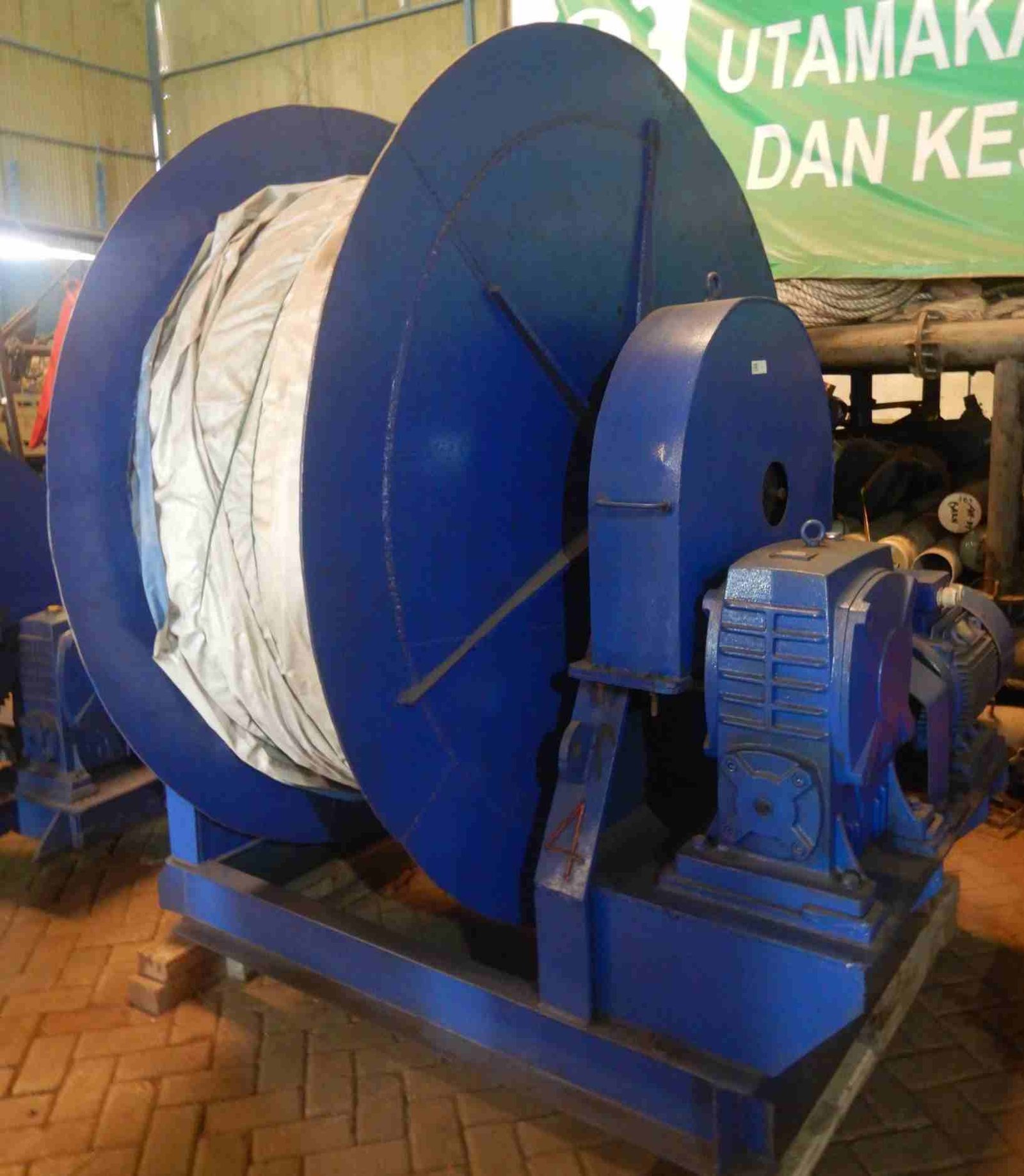 DABN-CD-001 | CABLE DRUM | CABLE DRUM : Material A-283 Gr C , tebal 12 mm DRUM : Diameter in 2400 mm; Diameter out 2500 mm DIMENSI RANGKAIAN DRUM, MOTOR, GEAR BOX : Panjang :4055 mm, lebar 2500 mm, tinggi 2775 mm. . NOTE : CABLE DRUM INI MERUPAKAN MODIFIKASI DARI WINCH ELECTRIC WE-001