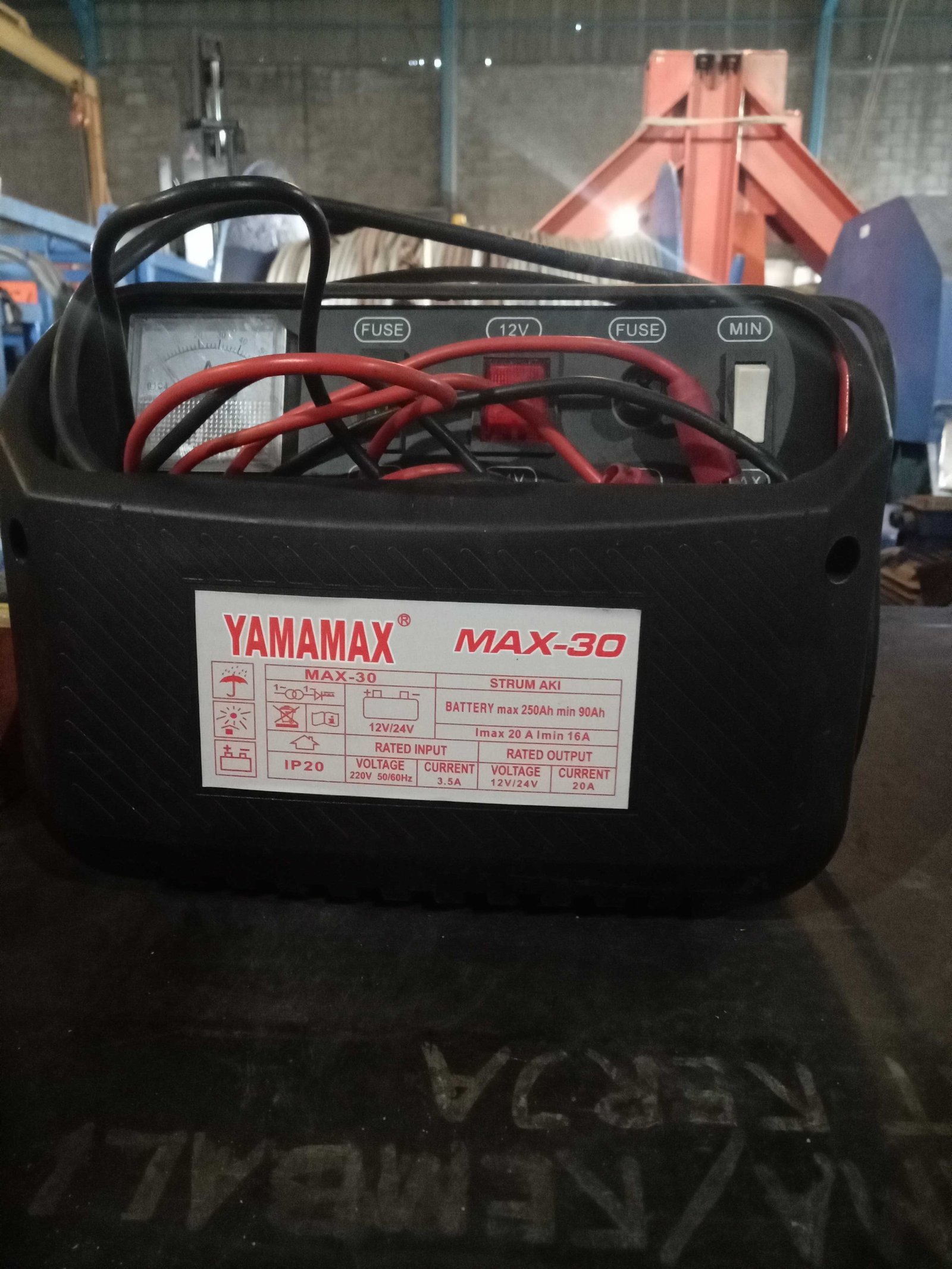 DABN-PAC-004 | TRAFO ACCU | Merk / Model : YAMAMAX / MAX-30 Rated Input : Voltage 220V, freq 50/60Hz, Current :3,5A Rated Output : Voltage 12V/24V, fCurrent :20A Battery max 250Ah, min 90Ah Imax 20A, Imin 16A |